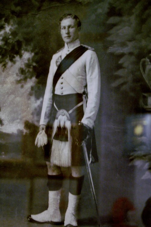In the photo he is seen in the same kilt, which he was wearing when he fell in Flanders in WWI. High on another wall is a cross that bears his name.